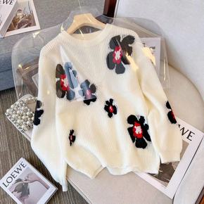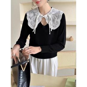 漂亮秋季镂空刺绣复古盘扣娃娃领针织衫女宽松减龄拼色...