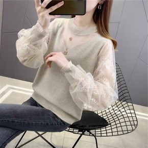 打底衫女新款蕾丝针织衫镂空上衣春秋宽松拼接毛衣洋气...