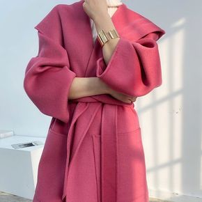 玫红双面连帽羊绒大衣女秋冬中长款大码驼色气质毛呢外...