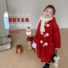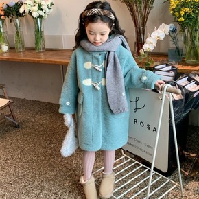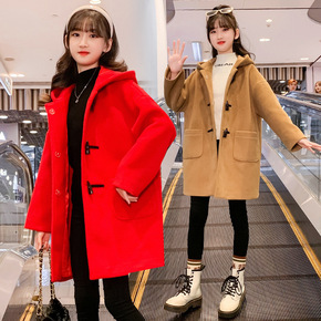 女童冬款加厚毛呢外套儿童韩版洋气牛角扣连帽大衣中长...