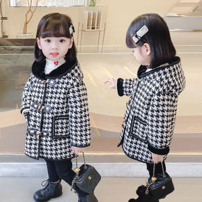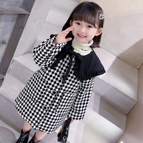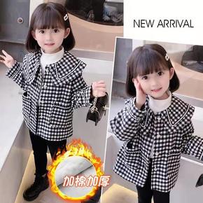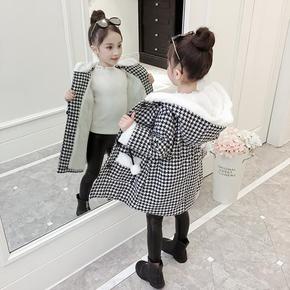 女童秋冬装千鸟格外套加绒儿童中长款披肩上衣中大童冬...