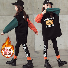 运动套装2021秋冬新款女童韩版连帽卫衣套装纯色高...