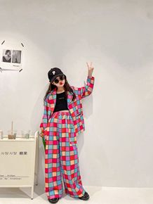 韩版秋季新款男女儿童彩色方格翻领单排扣西装外套直筒...