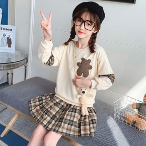外贸夏季货源童装女童韩版短袖套装中大童T恤格子裙两...