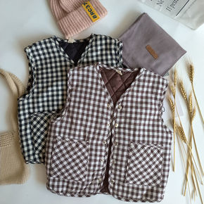 儿童背心秋冬韩版黑白格子夹棉马甲男女宝宝复古加厚保...
