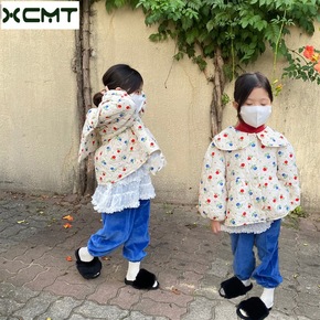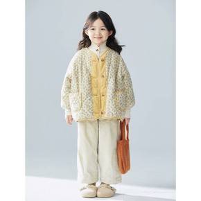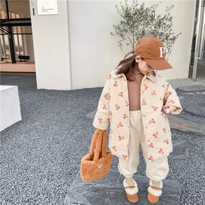 厚款女童冬款韩系可爱碎花夹棉灯芯绒鹅黄色棉袄外套...