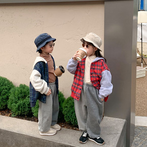儿童2021冬款韩版ins男女童格子夹棉保暖小熊棉...