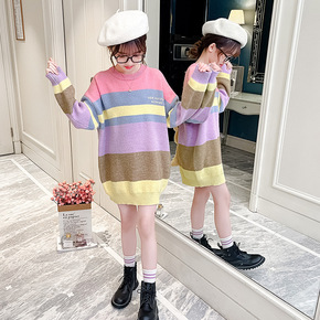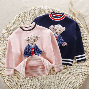 童装2021春秋新款女童彩条小熊毛衣宽松洋气儿童针...
