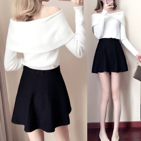 秋冬季新款韩版露肩翻领气质长袖套头毛衣加针织A字短...