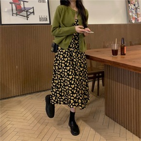 早春新款复古灯芯绒碎花吊带连衣裙加厚潮女装时尚休闲...