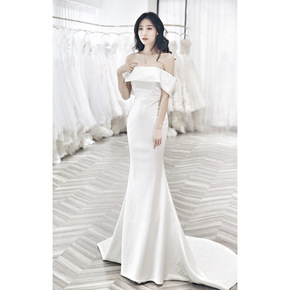 一字肩性感露背缎面轻婚纱拖尾夏季新款简约新娘结婚显...
