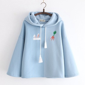 森女系秋冬甜美条纹兔耳朵刺绣连帽加绒保暖卫衣女学生...