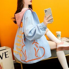 春秋新款韩版薄款连帽工装外套女学生卡通中长款宽松胖...