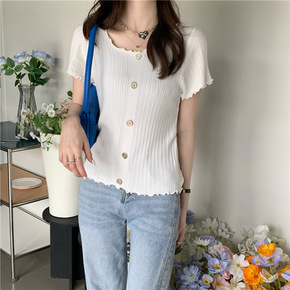 实拍实价 新款韩版修身百搭木耳边短款学生上衣女in...