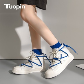 鮀品新款女鞋克莱因蓝帆布鞋潮鞋双鞋带高帮板鞋休闲运...