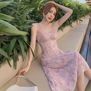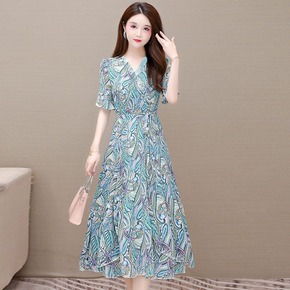 2022新款夏装收腰短袖连衣裙女显瘦气质女神范荷叶...