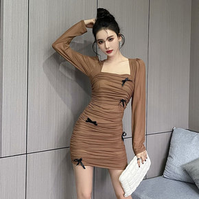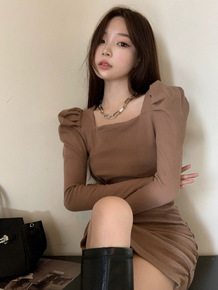 方领泡泡袖打底连衣裙女2022年秋冬新款法式气质收...