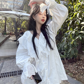 甜美衬衫裙女春装2022新款蕾丝拼接设计感荷叶边V...