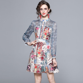 2022春季新款女装拼蕾丝花边立领长袖字母印花鱼尾...