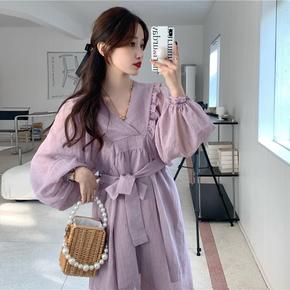 法式浪漫紫色连衣裙春装2022新款收腰温柔系灯笼袖...