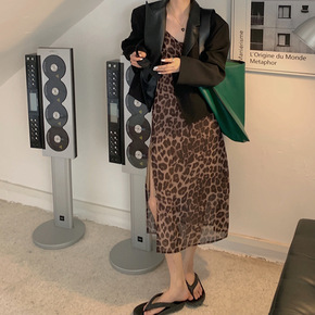 v领豹纹吊带裙女宽松开叉连衣裙2022春季新款设计...