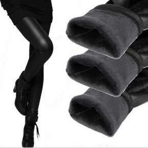 秋冬款仿皮裤加绒加厚打底裤加肥大码女装保暖黄金绒皮...