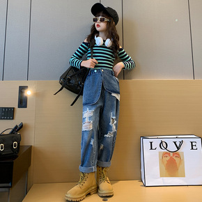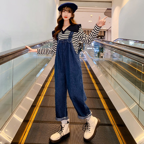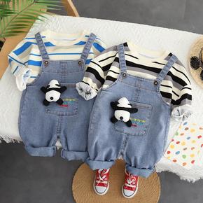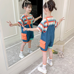 女童牛仔背带裤套装夏季新款儿童洋气休闲短裤条纹短袖...