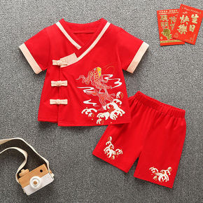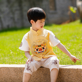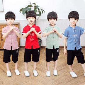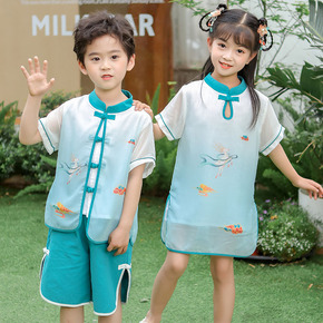男童中国风唐装女童民族风汉服夏季短袖两件棉麻套装六...
