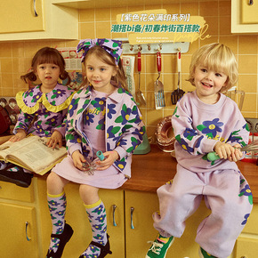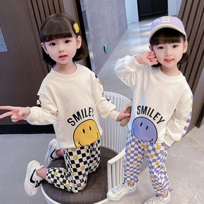 儿童装春季女孩棋盘格笑脸套装2022年休闲圆领卫衣...