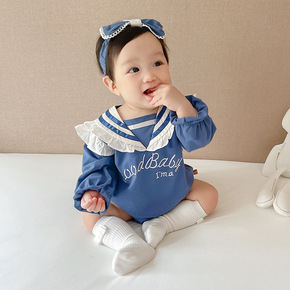 婴儿连体衣2021秋品女宝海军风哈衣送发带宝宝衣服...