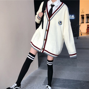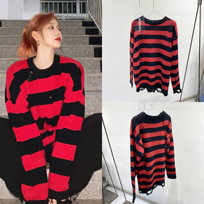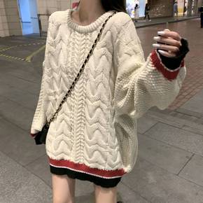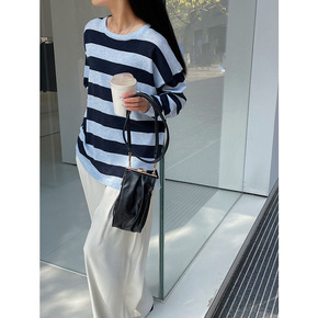 【不退不换】新款圆领粗条纹针织衫慵懒风韩版休闲宽松...