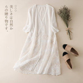 80830亚麻针织开衫薄外套女夏季空调衫拼接蕾丝中...