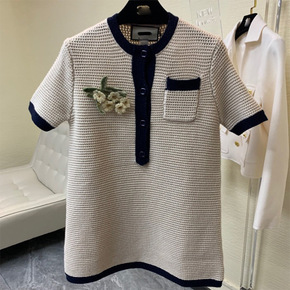 2022春秋法 圆领撞色边编织花朵别针针织短袖宽松...