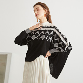 菱格拼色满满设计感 21秋季新款半高领羊毛衫慵懒风...