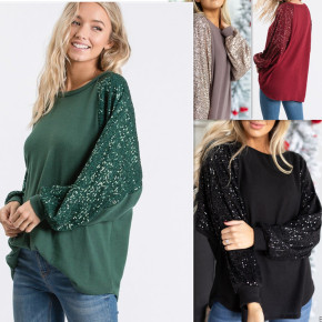 2021秋冬欧美亚马逊速卖通亮片拼接女装圆领宽松插...