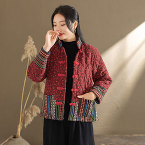 2021秋冬新款印花立领拼接棉衣外套女盘扣民族风夹...