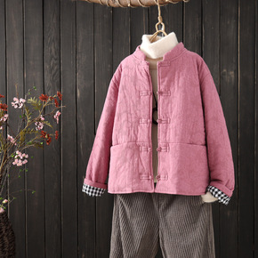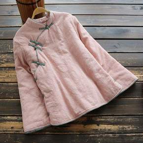 复古中国风棉麻提花保暖夹棉盘扣棉衣女2019秋冬文...