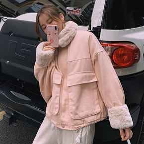 实拍ins甜美简约风立领宽松大口袋矮个子树莓色短款...