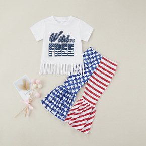 欧美跨境童装夏款女童洋气欧美风坑条网纱袖上衣+PU...