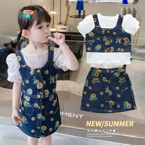 女童夏款套装宝宝洋气2022新款牛仔衬衫三件套小女...
