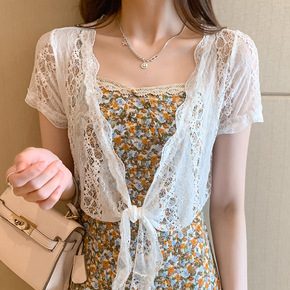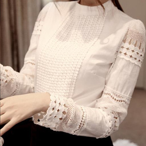 2016春秋新款优雅长袖白色打底修身雪纺勾花镂空蕾...