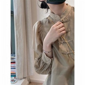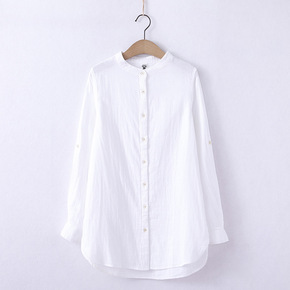 春夏双层棉纱中长款长袖衬衫女宽松立领衬衣女上衣防晒...