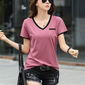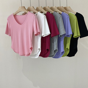 韩国实拍2022夏季新款女装宽松弹力短袖T恤女士V...