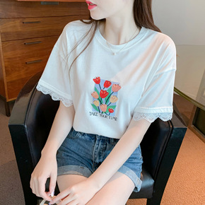 蕾丝印花纯棉短袖t恤女装夏装2022年新款上衣设计...