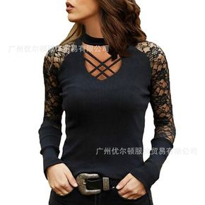 蕾丝打底衫女长袖春秋装2022新款网纱上衣大码圆领...