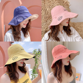 ②笑脸渔夫帽女双面大檐防晒遮阳帽子夏天韩版潮折叠太...