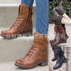 跨境外贸秋冬新品欧美侧拉链前系带骑士马丁靴亚马逊厚...