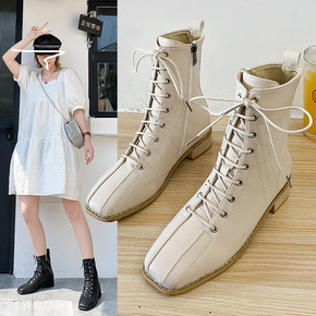 方头粗跟短靴ins潮2021秋冬新款加绒马丁靴时尚...