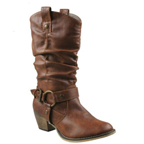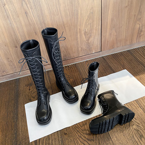 跨境外贸靴子女秋冬新款高筒靴复古英伦皮带扣粗跟马丁...