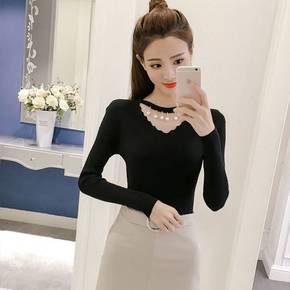 2022春秋新款钉珠修身洋气长袖针织衫V领镂空打底...